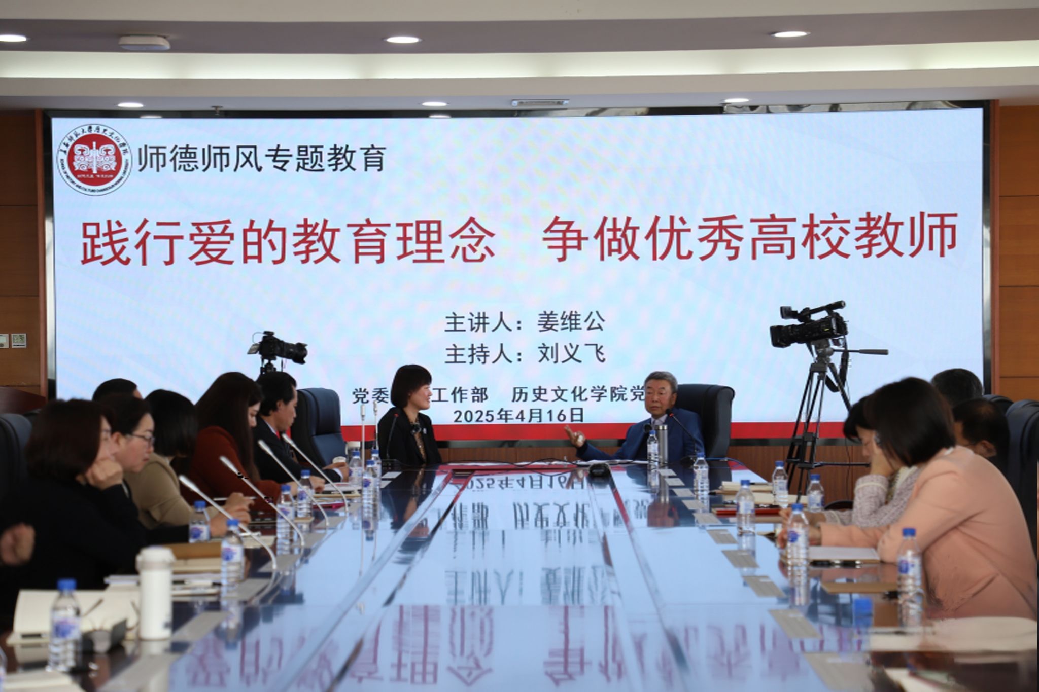 为进一步加强师德师风建设,弘扬教育家精神, 提升教师责任感、使命感、荣誉感。4月16日,学校党委教师工作部和历史文化学院党总支在教学综合楼1401会议室召开师德师风专题对话交流会。会议由历史文化学院教师、长白山学者、吉林省教学名师、“吉林省高校黄大年式教师团队”负责人姜维公教授主讲,历史文化学院党总支书记刘义飞主持会议。